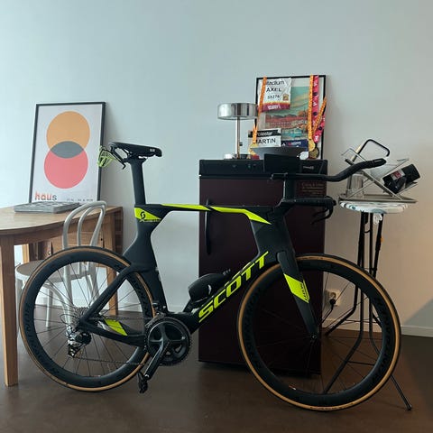 Säljes som cykeln nu är med Pro-säte med carbon skenor, shimano pedaler, watt vev och dessutom kommer den med Elites egen aero flaskhållare och EC DYNAMICS aerobar extensions. Vevlagren har samma keramiska lager som i hjullager på diskthjulet.
