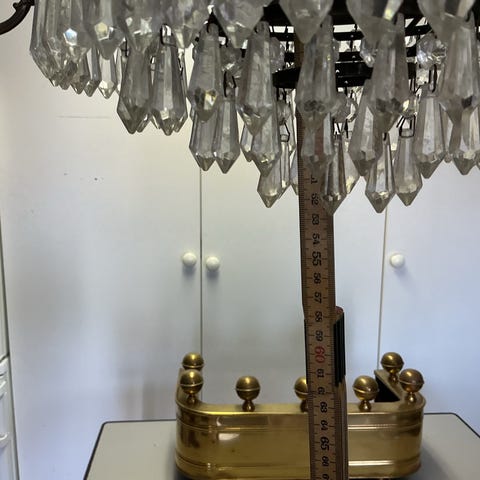 Bordslyster, mässing och prismor, 2 ljushållare, 1900-talets första hälft några av prismorna är amatörmässigt monterade