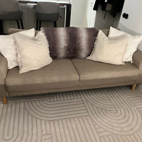 Bekväm vit soffa som passar perfekt i vardagsrummet. Två sits soffa. Helt okej skick lite märken och skavanker behövs rengöras. Monteras lätt ihop säljs ner monterad. En av bultarna som går från soffans arm trillar ner så vi har gjort ett hål på undersidan så man kan plocka upp den.