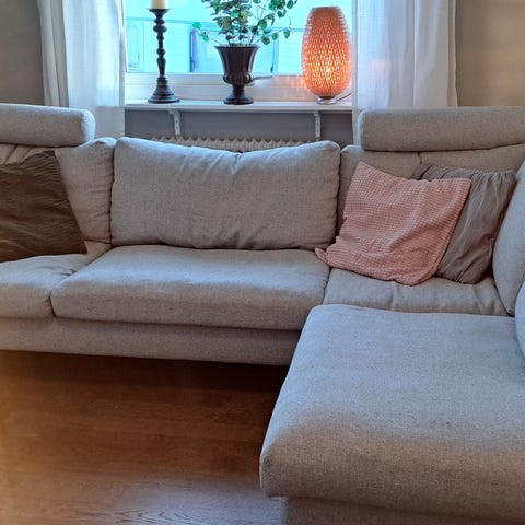 Materialet är mörkgrå sammet. Soffa - 292 cm Fotpall - 80 cm Har varit använd i ca ett års tid. Har haft filtar ovanpå den för att det har funnits katt och hund i hemmet. Inga fläckar eller märken. Säljes på grund av flytt. Originalpris ca 16.000 kr.