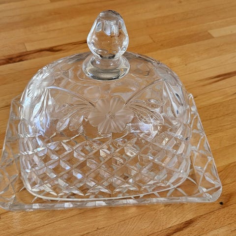 Äldre marmelad/syltburk. Locket har en liten knappt synbar lagad spricka i själva böjen på ”handtaget” - se bild. Höjd utan lock 6 cm. Diameter botten 5 cm, upptill 8,5 cm. Kniv i nysilver längd 14 cm. 100:-, med kniv 125:-. Skickas ej, kan hämtas i Helsingborg.