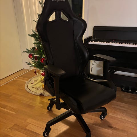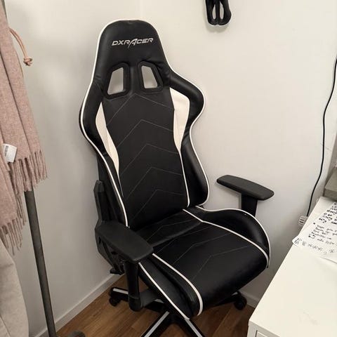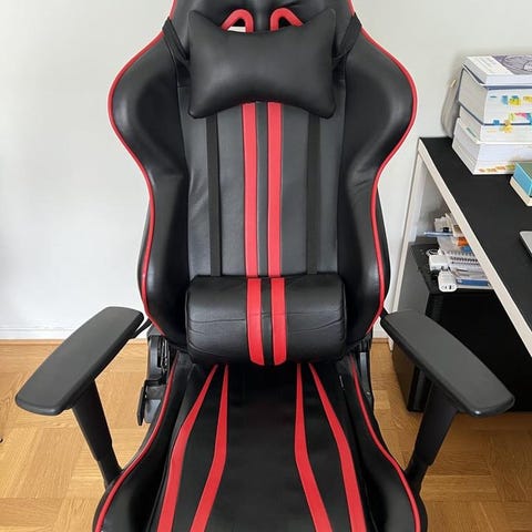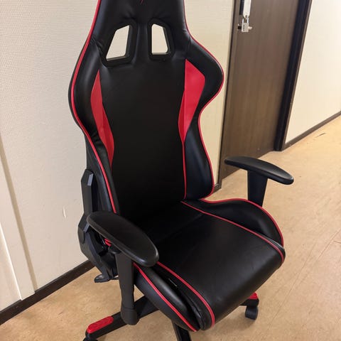 Bekväm, gjord för långa gamingsessioner. Endast fejklädret är utslitet, resten är i bra skick. Justerbara arm- och ryggstöd. justerbar svank- och nackkudde.