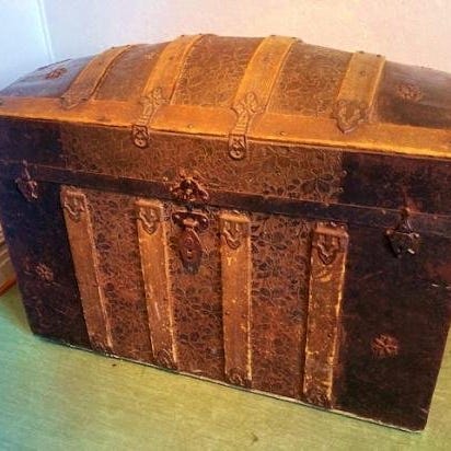 Gammal koffert. 50 cm bred, 90 cm lång, 30 cm hög. Sliten. Fläckigt tyg inuti