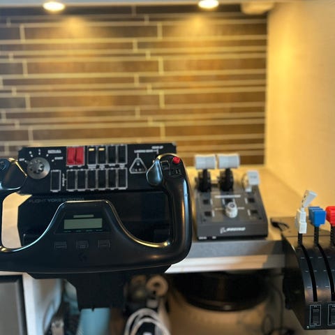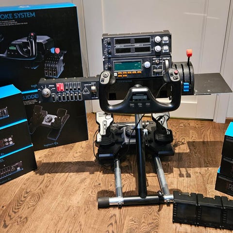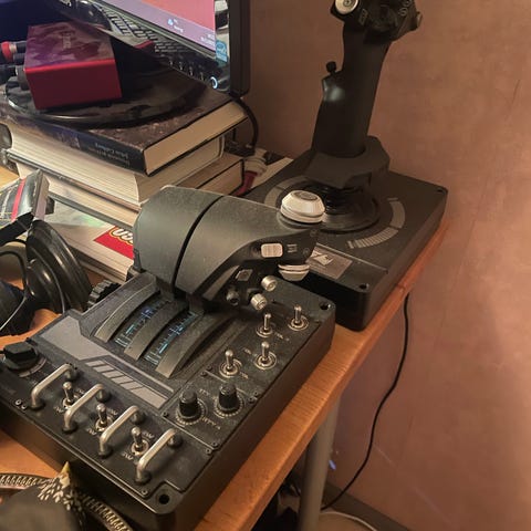 Vänster enhet – ThrottleGasreglage med flera axlar, vred och knappar för t.ex. motorstyrning, flaps, landningsställ m.m.