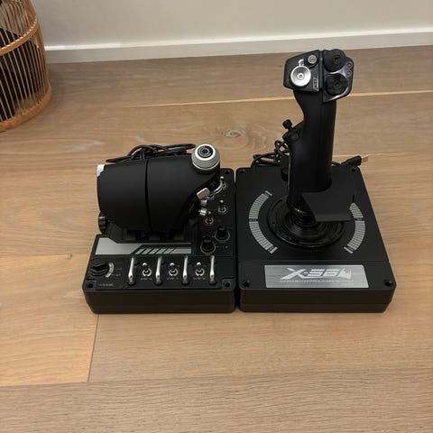 Höger enhet – JoystickStyr flygplanet i pitch (fram/bak) och roll (vänster/höger). Den kan också roteras för yaw (sidoroder) om du inte använder separata pedaler.