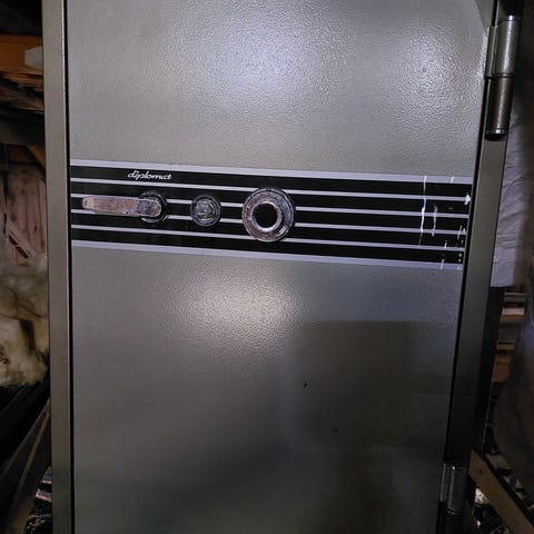 Metallskåp säkerhetsskåp med nyckellås. Skåpet är tillverkat i metall och har en dörr med handtag samt nyckellås, nyckel medföljer enligt bild. Invändigt finns ett större förvaringsutrymme lämpligt för exempelvis dokument, verktyg eller annan utrustning. Utsidan visar spår av användning med färgavslag, men konstruktionen är robust. Passar för förvaring i till exempel garage, förråd eller verkstad där man vill ha låsbar förvaring.