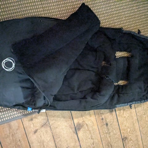 Den har ett dunlager som kan tas bort under varmare dagar som vår och höst. Den levereras med sin originalväska och är en relativt nyare version av Bugaboo åkpåse.