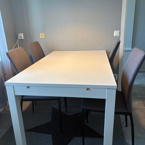 Säljer ett bord med 6st tillhörande stolar i fint skick. Finns något litet märke på bordet men annars är allt mycket fint.