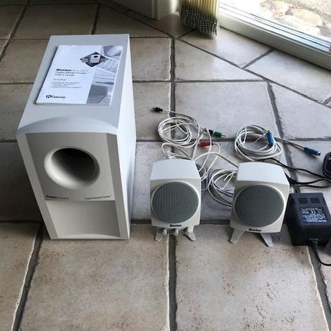 En uppsättning med 5 st (7 på bild men bara 5st kvar) vita Boston Acoustics Soundware XS inkl. matchande subwoofer. Följde med min nya förstärkare så ej testade.