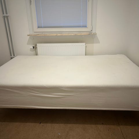 Säng: Madrassmått 90x200 cm. Yttermått cirka 102 cm bred, 210 cm lång, 90 cm hög. Stabil ram i trälook med marina mässingsdetaljer.