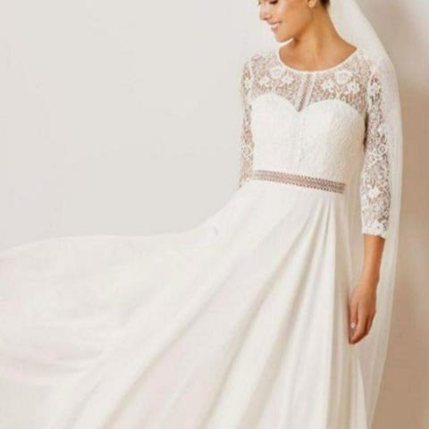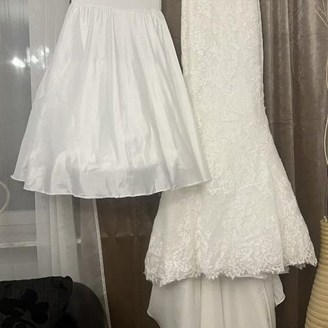 Klänning säljes tillsammans med handskar. Använd en dag därefter kemtvättad. Storlek 38. Personen på bild är 177cm.