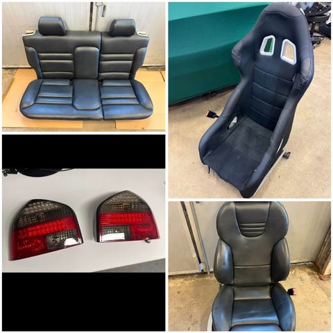 Säljes två sportstolar, orange/svart enl. bild, sitter skenor under, suttit i Porsche 911 -75. Fint skick i konstlädret. Lätta sportsäten.