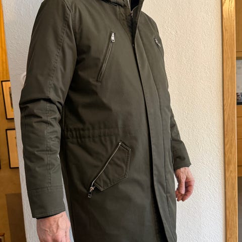 Rejäl parka i återvunnen nylon som behandlats med det vattenavvisande medlet BIONIC-FINISH®ECO och en insida fodrad med dun och fjädrar. Jackan stängs framtill med en tvåvägs dragkedja och har gott om praktiska detaljer: in- och utvändiga fickor, huva med justerbar dragsko, slitsar i sidorna med logotyppräglade tryckknappar samt varumärkesetiketten i gummi på ena ärmen.