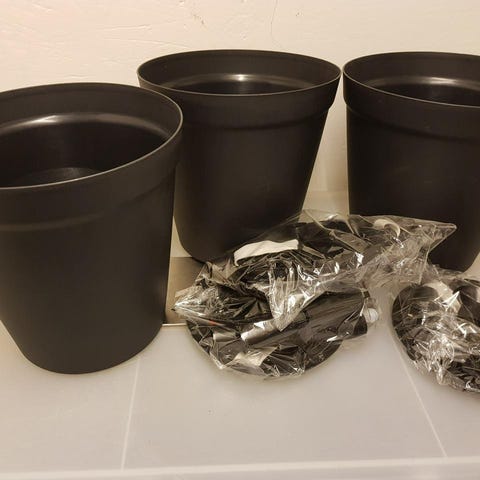 En stor svart kruka med handtag säljs för 200kr.