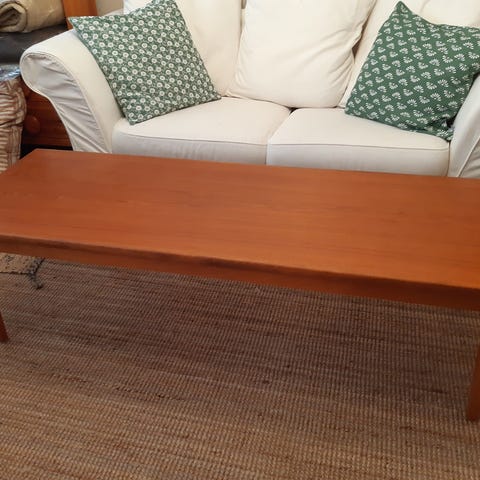 Charmigt soffbord i teak. Säljes i befintligt skick. Helt och stabilt, en del vattenfläckar (se foton) går säkert att återställa dess forna glans genom att typ olja in eller liknande.