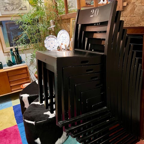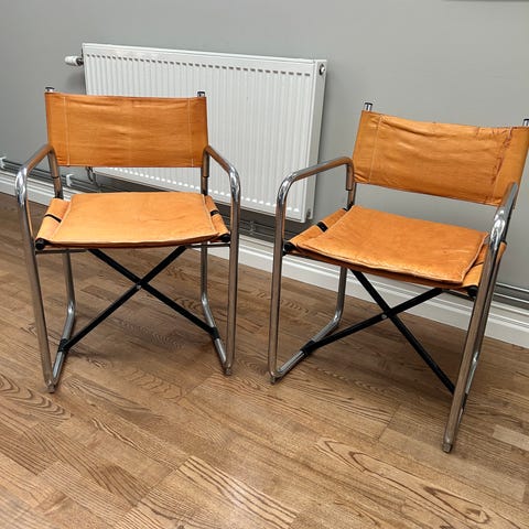 Stomme av förkromat stålrör. Sits och rygg av läder. Ihopfällbara.