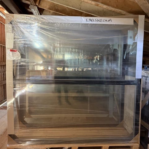 Nya aluminiumbeklädda träfönster, vit 0500 in/utvändigt, 3-glas personsäkert (laminerat glas, in /utsida) varmkant.