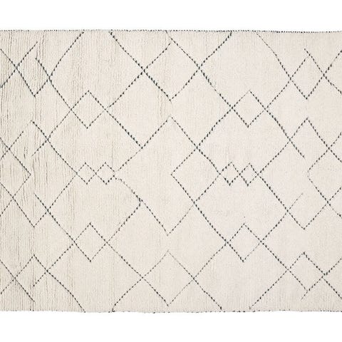 Snake Rya Rug Off White är en handvävd matta gjord av 100 % ull. Mattan har ett oregelbundet ormmönster där vissa delar är plattvävda, medan andra har lång lugg. Denna kombination, som ger hög och låg effekt, har blivit utmärkande för flera av Dusty Decos mattor. Längs kortsidorna är mattan dekorerad med fransar.