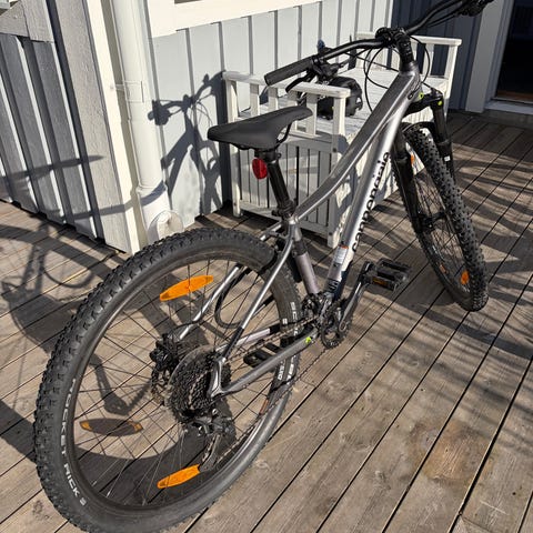 En mountainbike av märket KTM, hög kvalitet. Den har använts en del av mig men jag har alltid tagit väl hand om den. Min granne som är cykelexpert har hjälpt mig hålla den i högsta skick varje år. Den funkar perfekt för vägar, den har även ett offroad läge som höjer stötdämpningen. Finns även en matchande hjälm ifall man vill ha den också. Den kommer även med ett stativ samt lampor både fram och bak som har köpts separat. Vill han ha kedjelåset som syns på bilden kan man få det också:)