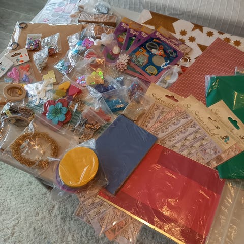 Snören/ band i olika utföranden. Kuvert i olika utföranden. En påse fullt med blommor i olika storlek, material och formar.