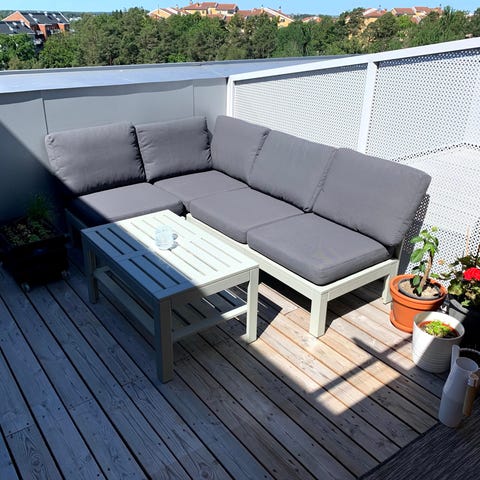 Loungeset i vitlackad aluminium, med dynor i mörkgrått tyg. 3 fåtöljer 1 soffa.