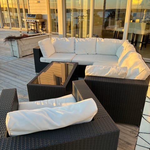 Loungeset i vitlackad aluminium, med dynor i mörkgrått tyg, något solblekt. 3 fåtöljer 1 soffa.