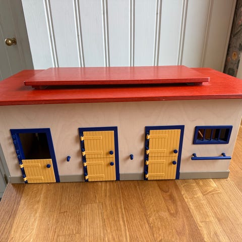 coolt hus miniatyrhus av trä, mått 58x39x47 cm. dockhus? trädgårdsprydnad? finns gångjärn i taket/nocken, men främre delen av taket får köparen fixa själv, sådant medföljer inte. helt å stabilt, men lite skavanker är det.