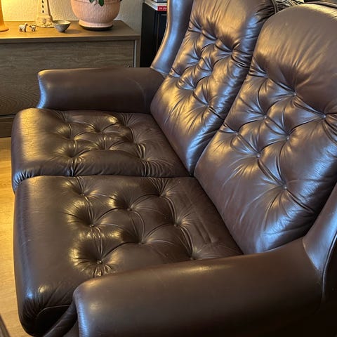 Mörkbrunt skinn. Använd men väl omhändertagen.