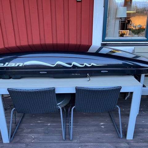 Liten Thule takbox monterad med packutrymme bredvid och ev. under.