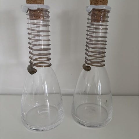 Olja och Vinäger set är tillverkat i klarglas med kork, ett fin set för olja och vinäger,eller som prydnad. Höjd 23 cm/diameter i botten 8,5 cm. Made in Italy. Pris 50 kr.