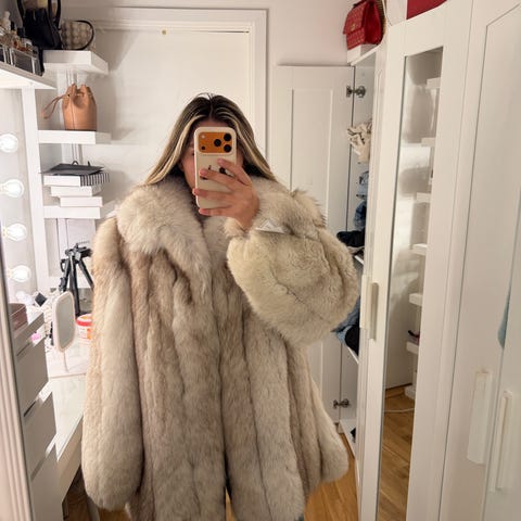 Äkta vit päls. Elegant design med en ljusgrå kant på huvan som ger en stilren kontrast. Jackan har en liten reva på ryggen som enkelt kan lagas hos en skräddare. I övrigt är den i mycket bra skick. Fräsch, välvårdad och utan lukt. En snygg, varm, mjuk och lätt jacka som passar perfekt under kyligare dagar.