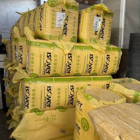 Isolering av glasull i olika tjocklekar och storlekar, använd för värmeisolering i byggnader. Materialet är gult och fiberrikt, lämpligt för att förbättra energieffektiviteten och minska ljudöverföring.