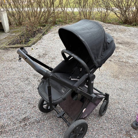 Barnvagnen har stomme i Matt black och klädsel i snygga Indigo/Navy blue. Alltid förvarad inomhus och i fint skick.