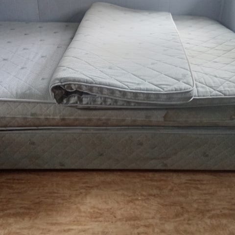 IKEA dubbelsäng som är 10 år gammal men väldigt bekväm. Flera mindre fläckar på både bäddmadrassen och gaveltyget som ses på fotona.