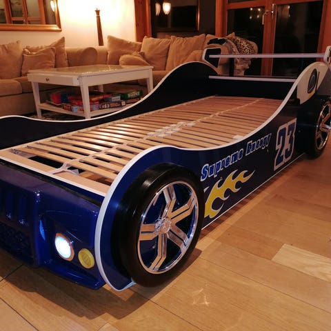 Barnsängen för bilfantasten i fräcka färger och stickers, känn dig som en racerförare när du går till sängs på kvällen. Bekväm och robust i lackad MDF.