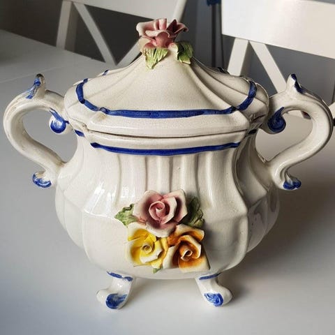 Någon slags keramik. Höjd ca 10 cm och diametern är upptill ca 10 cm.