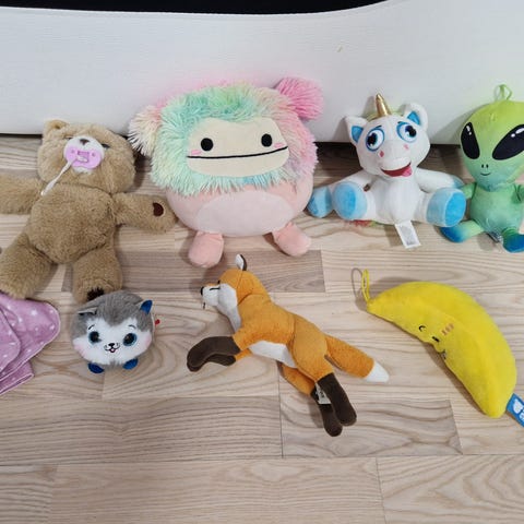 Ett set med blandade gosedjur. Inkluderar en hund med ett hjärta, en nallebjörn, en rosa kanin med rosett och en enhörning.