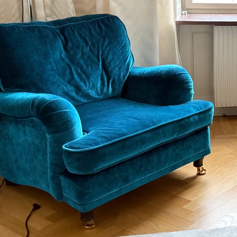 Sweef Flamingon fåtölj i skogsgrön sammet. Urläcker och mysig fåtölj med höga stålben. Färgen skiftar i grön/silver/brun/lila beroende på ljus, svårt att få en rättvis återgivning på bild. Tyget är lätt att torka av med en fuktig mikrofiberduk. Benen går att skruva av vid transport.