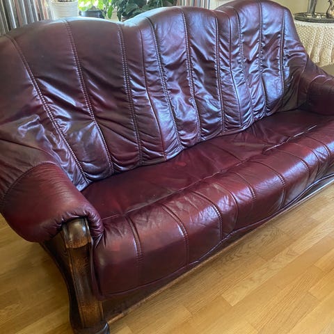 vinröda soffor helskinn även baksidan, finns 2 st. Har kostat 8000kr/st Längd 140cm Bredd 85 Höjd 100cm Sitthöjd 47cm Finns i Lund (Prinsens lager) Kan ordna leverans mot ersättning