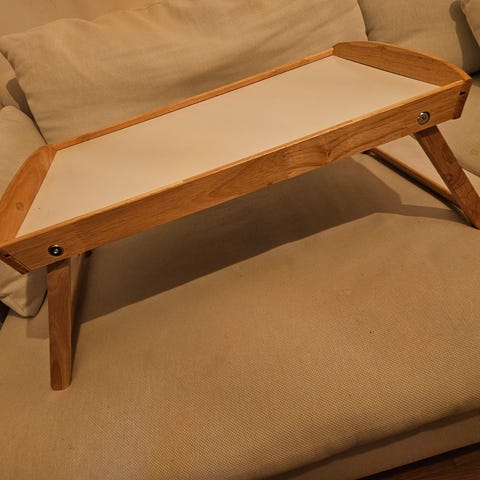 Brickbord, frukostbricka eller bricka med ben. Okänt träslag men den vita ytan är högblank och skicket är som nytt då den aldrig använts.