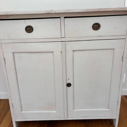 Bild 4-6 Antik ljust grå skänk med tre lådor och bakbordskant