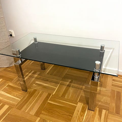 • Rektangulärt bord: guldfärgad geometrisk metallram med glasskiva.