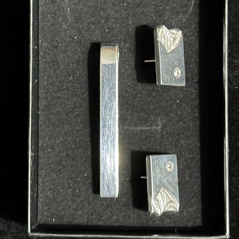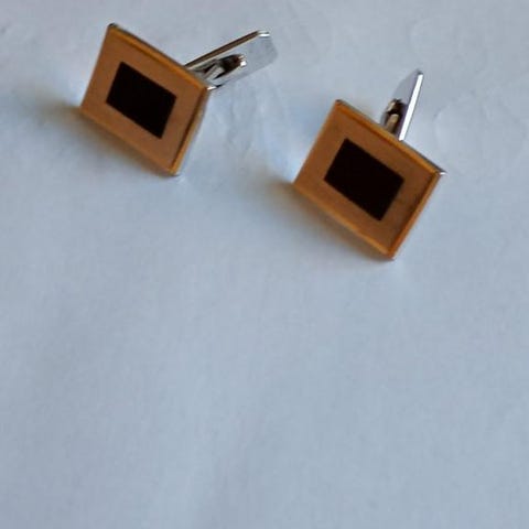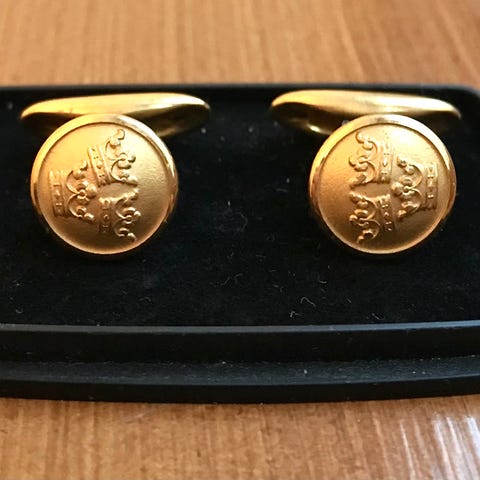 Ett par eleganta manschettknappar i guldton med den svenska tre kronor symbolen. Baksidan är stämplad med "SPORRONG”.