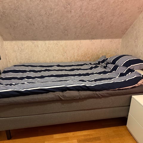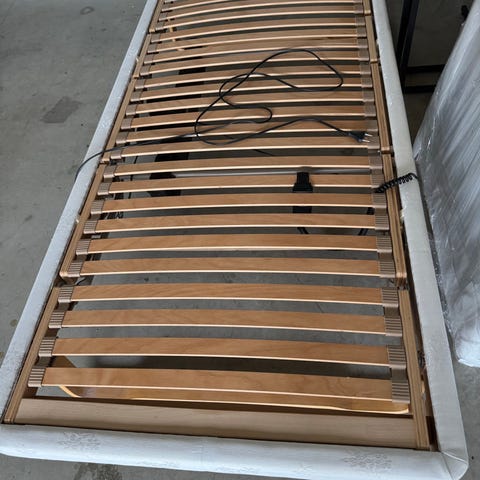 Mycket fräsch höj- och sänkbar sängbotten 120x200 cm med träribbor inklusive fjärrkontroll, fungerar perfekt. Köp till en ny madrass och du har en perfekt gästsäng!