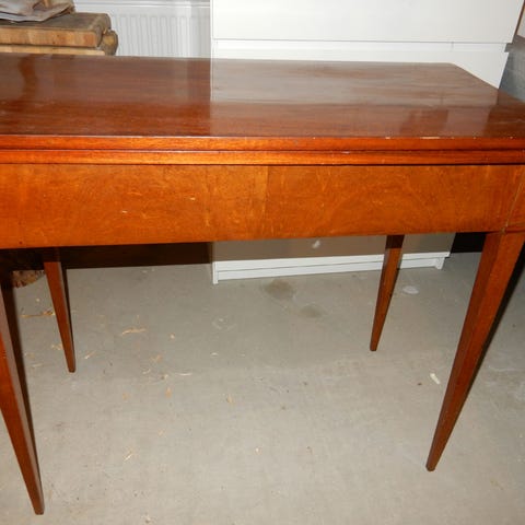Utfällbart spelbord med porslinshjul. Faner släppt på liten del av skivan i utfällt läge. Se bild