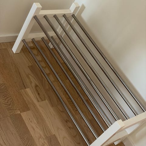 Stadig och stabil trapp för mindre hundar. Snickrad av utbildad snickare och därför inget Kina-rappel. Målad/betsad och halkfria mattor är limmade på trappstegen. På väggen av trappen kan man göra en öppning för husdjur eller förvaring. Trappen kan stå på sidan och i fotändan av sängen. Trappens längd: 162 cm Stegbredd: 30 cm Steglängd: 40 cm Stakethöjd: 28 cm överlag / 16 cm längst upp vid sista steget Höjd till nästa steg: 16 cm HÄMTAS. Vid fler frågor: maila !