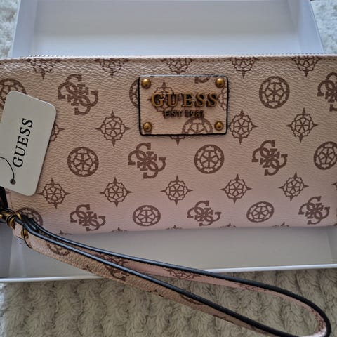Brun Guess plånbok med ett ormskinnsmönstrat band över mitten. Plånboken har ett ”G” monogram tryckt över hela ytan. Säljer helt nya guess plånbok den är ny använt bara 1 gång