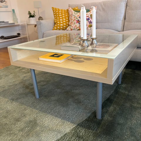 Fint exemplar av soffbord från IKEA. Modellen heter Magiker och har utgått ur IKEA:s sortiment. Glasskiva på trästomme i björkfaner, ben i borstat stål. Finns att hämta på Kungsholmen.