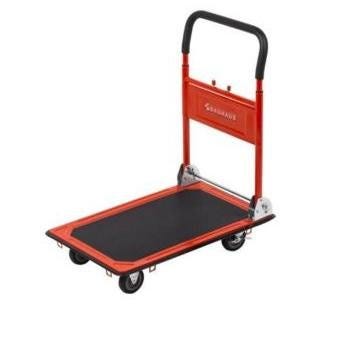 Robust konstruktion med stora plastbelagda hjul och gummerad platta som skyddar materialet.