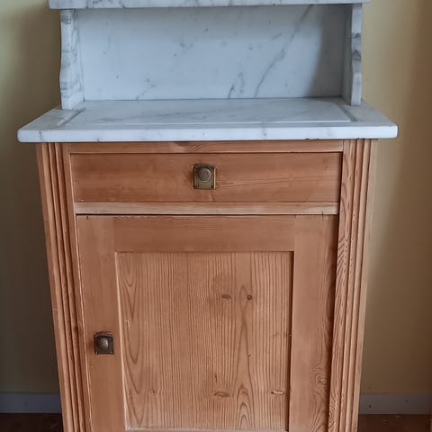Säljer en helt ny vit kommod/badrumsskåp i trästruktur med modern design.